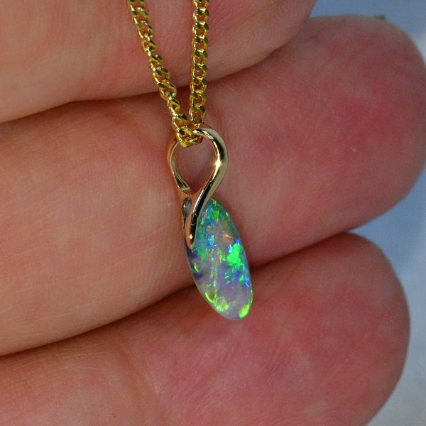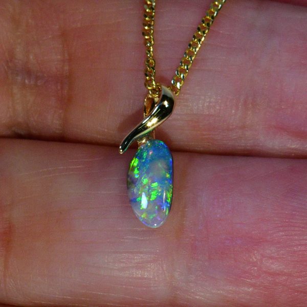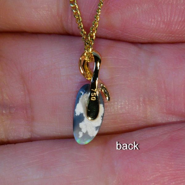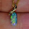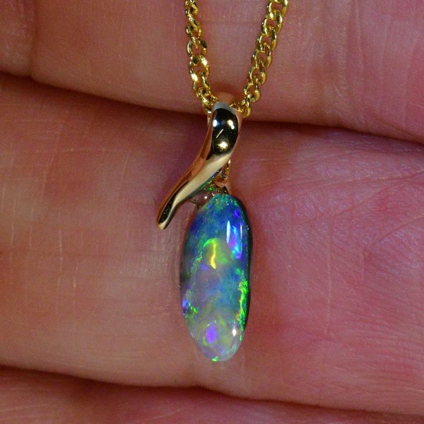 Australian natural solid unique opal pendant in solid 18k yellow gold, what a wonderful and inexpensive gift idea. Made right here in our goldsmithing/opal cutting workshop on the Gold Coast Australia, this wonderful natural solid Lightning Ridge black opal ranges from an N2 dark background to crystal opal. Displaying gorgeous hints of pinks and yellow with lots of fiery green colouring. With a combined weight of 1.76 carats and opal measuring 10.95mm X 4.43mm X 1.48mm, this 3.8 out of 5 bright black opal is set into a solid 18k yellow gold pendant. This beautiful pendant comes with a complementary 45 cm (18″) plate chain and gift boxed, perfect for that gift giving.