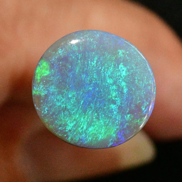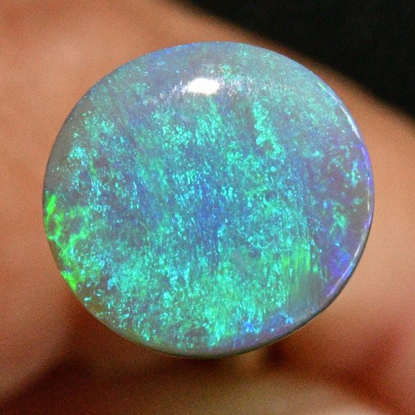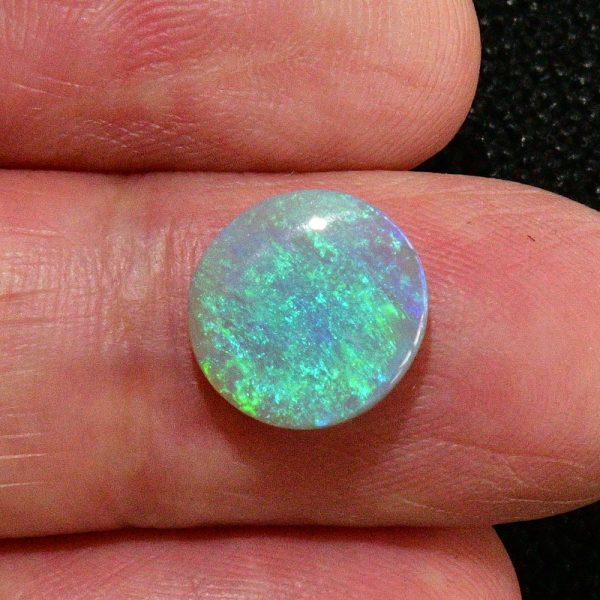 Genuine solid natural Australian opal showing gorgeous green/blue colours. From the famous mines of Lightning Ridge Australia, this beautiful opal measures 11.42mm X 10.90mm X 3.33mm thick. This 2.2 out of 5 bright, N6 dark 2.78 carat solid Australian opal would make a magnificent ring.