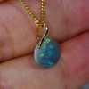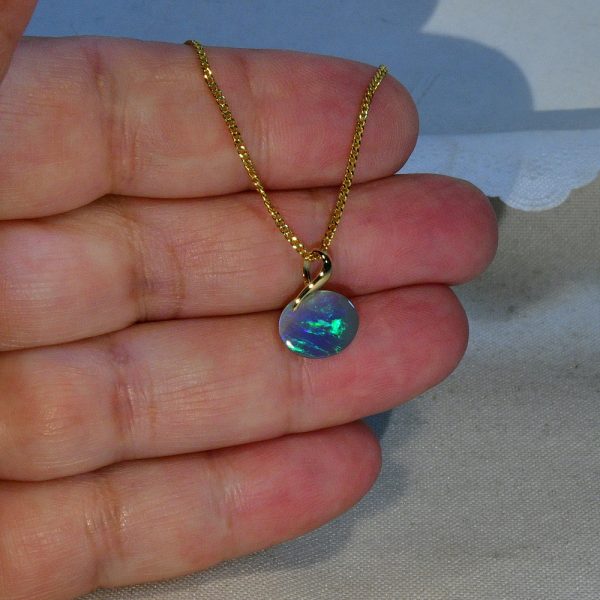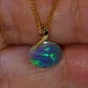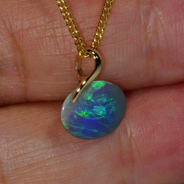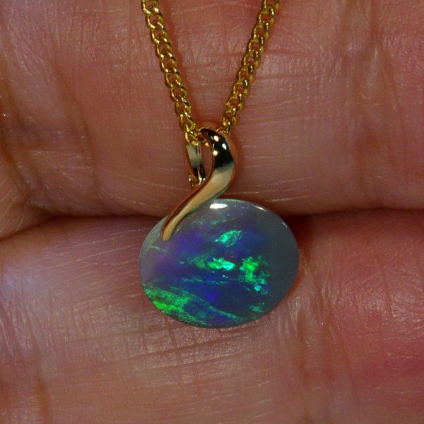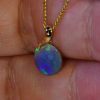 Genuine Australian natural solid black opal pendant in solid 18k yellow gold, what a wonderful and inexpensive gift idea. Made right here in our goldsmithing/opal cutting workshop on the Gold Coast Australia, this wonderful natural solid Lightning Ridge black opal shows stunning flashing azure blue with green and violet colouring. With a combined weight of 2.30 carats and opal measuring 9.89mm X 10.50mm X 1.40mm, this 3.6 out of 5 bright N4 dark black opal is set into a solid 18k yellow gold pendant. This beautiful pendant comes with a complementary 45 cm (18″) plate chain and gift boxed, perfect for that gift giving.
