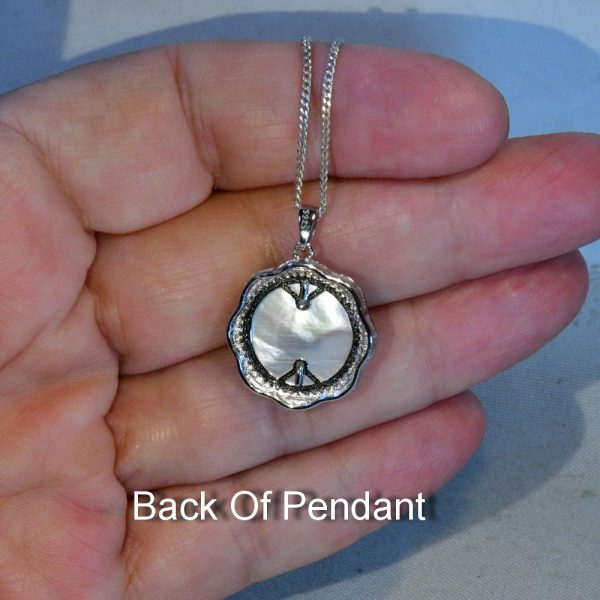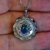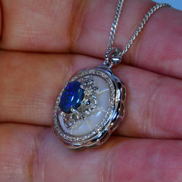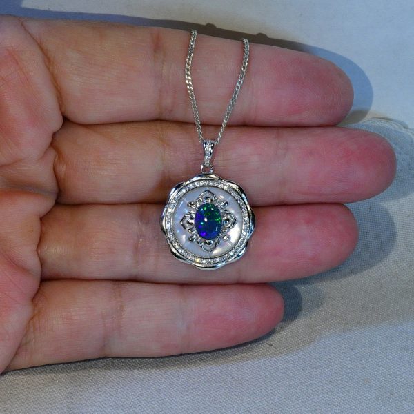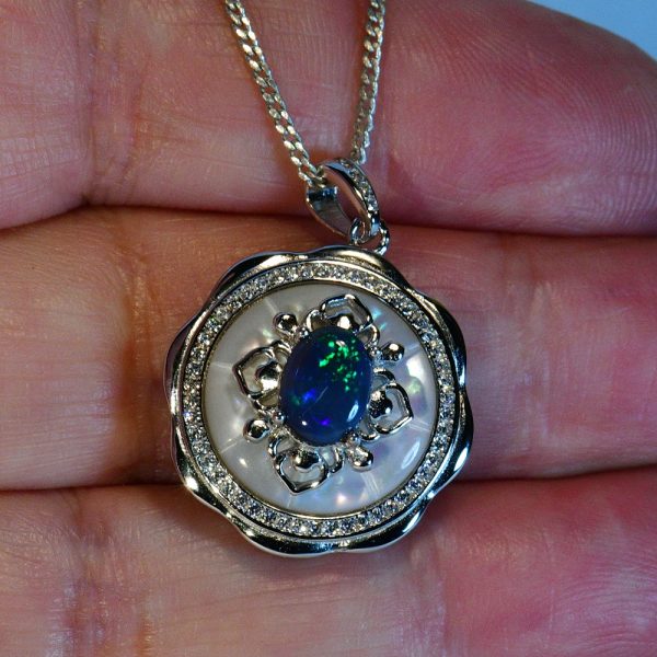 This is something special, a wonderful solid natural black opal in solid sterling silver. This beautiful 8.0mm X 6.0mm (approx) solid natural N2 dark Lightning Ridge Australian black opal displays 3.5 out of 5 bright fiery flashing green with hints of blue colouring. Set onto a backing of mother of pearl and highlighted by 60 cubic zirconias, the pendant measures 26mm X 20mm and comes with a complementary 45 cm (18″) plate chain and gift boxed, perfect for that gift giving. This is a one and only, you will never see an identical opal pendant, so when it’s gone it’s gone.