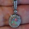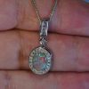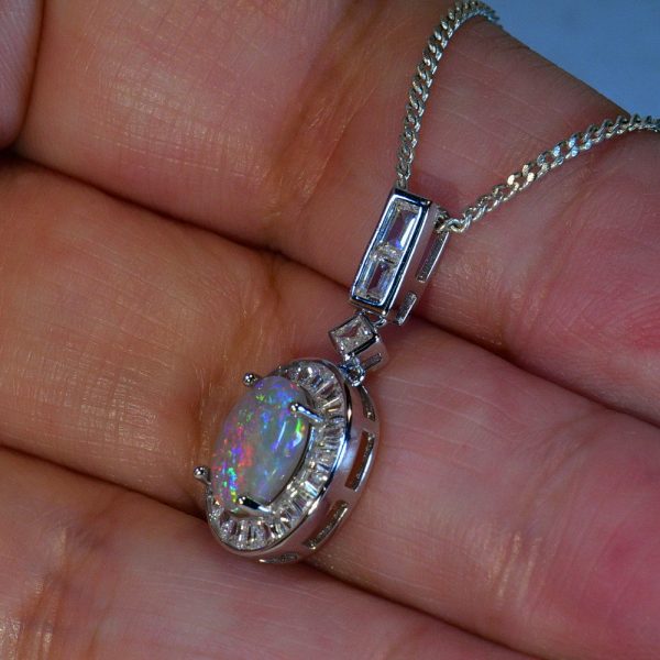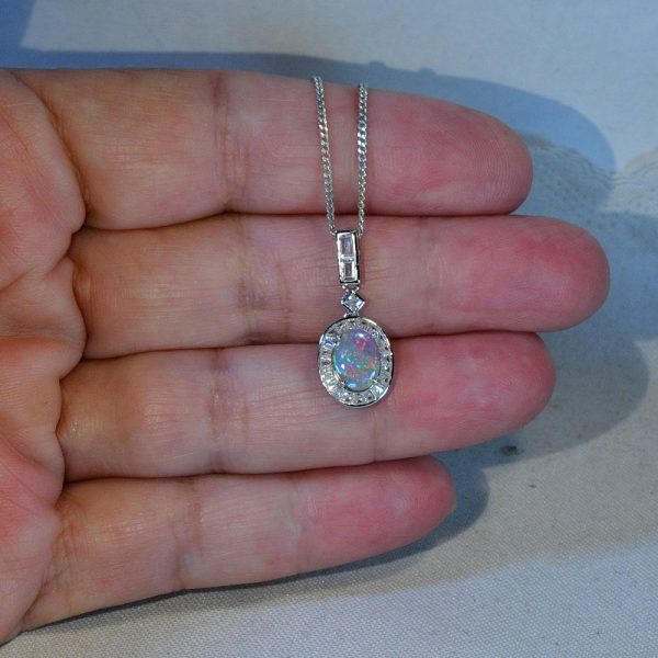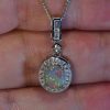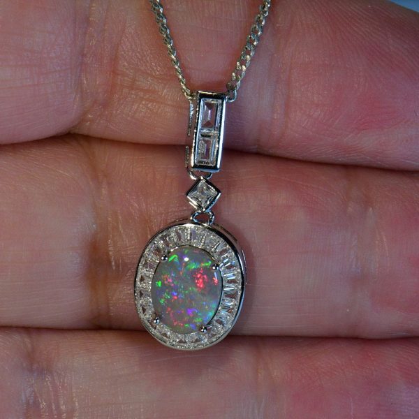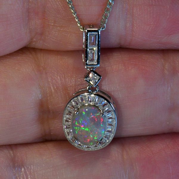 Wonderful solid natural opal in solid sterling silver. This beautiful 9.0mm X 7.0mm (approx) solid natural N6 dark Lightning Ridge Australian opal displays 4 out of 5 bright fiery reds, orange, green and blue colouring. Highlighted by 23 cubic zirconias the pendant measures 25mm X 10mm and comes with a complementary 45 cm (18″) plate chain and gift boxed, perfect for that gift giving. This is a one and only, you will never see an identical opal pendant, so when it’s gone it’s gone.