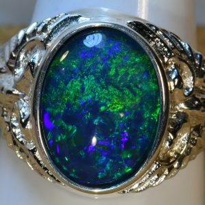 Magnificent fiery Australian opal in this bezel set men’s 14k white gold opal ring. This beautiful genuine South Australian 10mm X 8mm opal triplet with stunning 4.7 out of 5 bright flashing and dancing reds with orange, yellow, greens and blue colors on an N2 dark background. Of course this stunning ring comes gift boxed and we are offering free resizing, the current ring size is T (US 9.75).