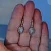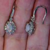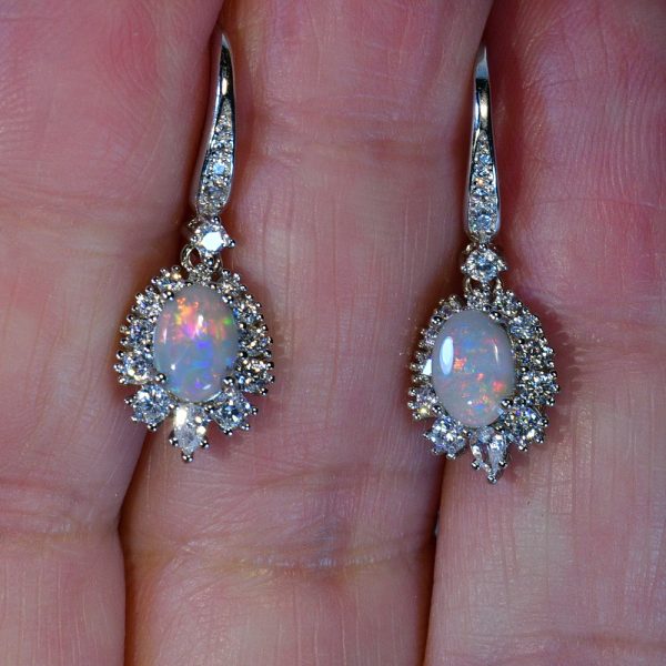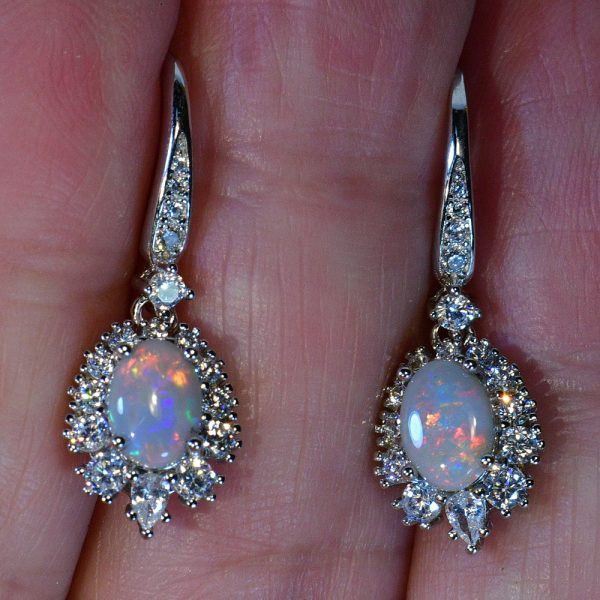 Wonderful solid opals in solid sterling silver. These beautiful 7.0mm X 5.0mm solid natural Coober Pedy white opals display 3 out of 5 bright pink, orange,  blue and green colouring. Each highlighted by 17 cubic zirconias , these earrings come gift boxed, perfect for that gift giving.