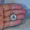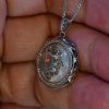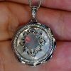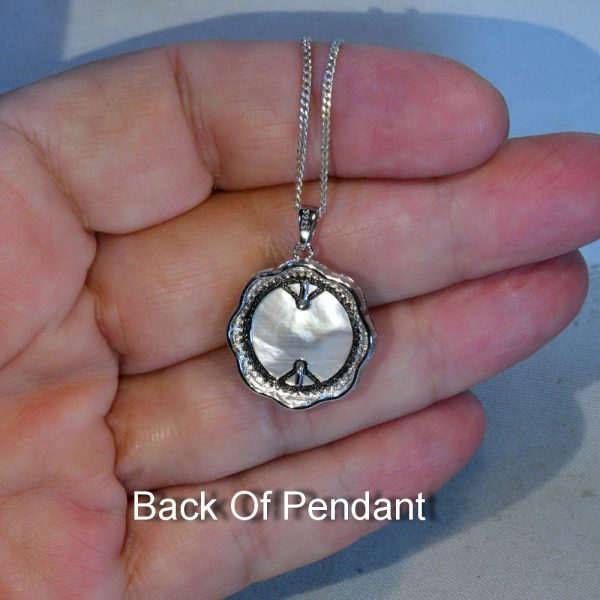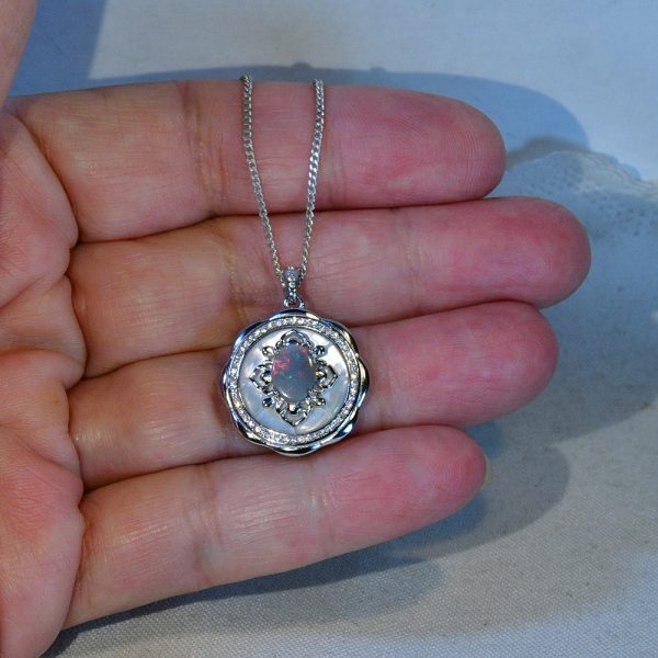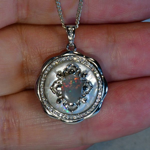 This is something special, a wonderful solid natural Lightning Ridge opal in solid sterling silver. This beautiful 8.0mm X 6.0mm (approx) solid natural N6 dark Australian opal displays 3 out of 5 bright flashing orange with hints of green colouring. Set onto a backing of mother of pearl and highlighted by 60 cubic zirconias, the pendant measures 26mm X 20mm and comes with a complementary 45 cm (18″) plate chain and gift boxed, perfect for that gift giving. This is a one and only, you will never see an identical opal pendant, so when it’s gone it’s gone.