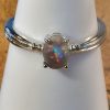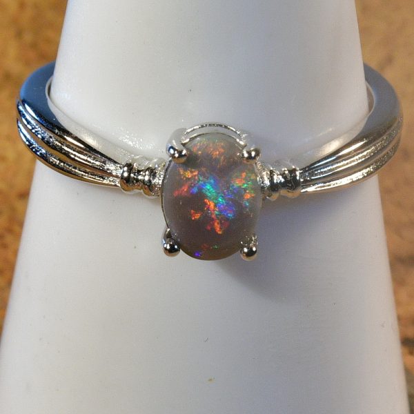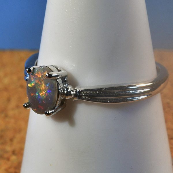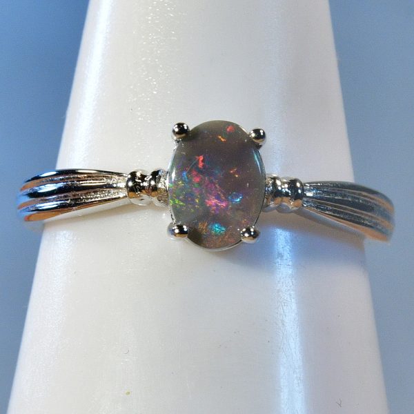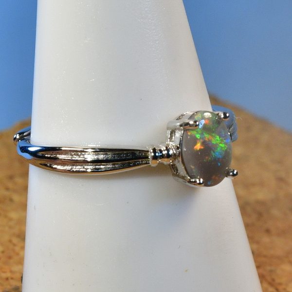 From the famous mines of Lightning Ridge Australia, this is a wonderful solid, natural, hand cut 6.52mm X 4.93mm N5 dark, 2.8 out of 5 bright opal showing wonderful red, orange, green, blue and violet colouring. Set securely in a 4 prong setting, this beautiful silver ring comes gift boxed and what a perfect gift it would be. This lovely ring is adjustable from size US 5.5 (size L) to US9.5 (S+1/2).