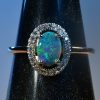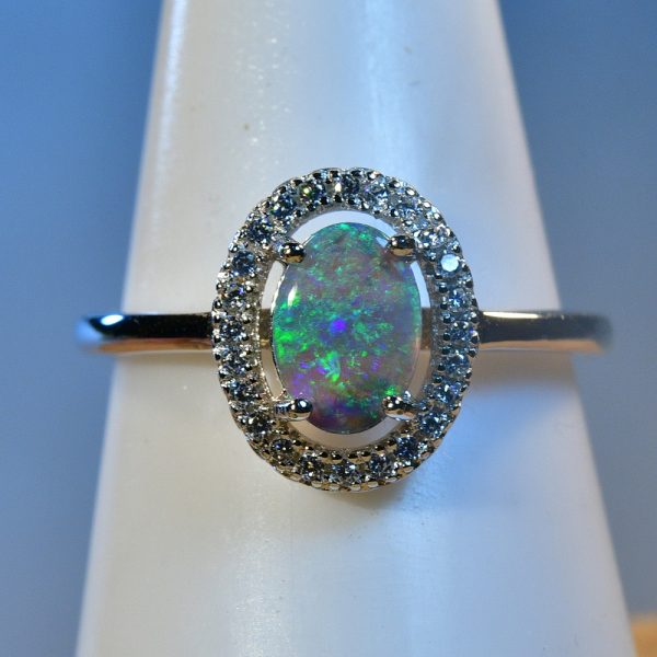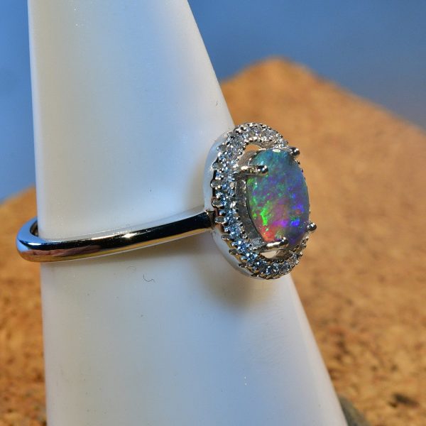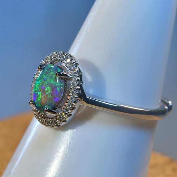 From the famous mines of Lightning Ridge Australia, this is a wonderful solid, natural, hand cut 7.03mm X 4.98mm black crystal opal showing 3.7 out of 5 bright green and blue colouring. Set securely in a 4 prong setting with 24 cubic zirconia surrounding, this beautiful silver ring comes gift boxed and what a perfect gift it would be. This lovely ring is adjustable from size US 6.25 (size M+1/2) to US10.25 (U).