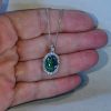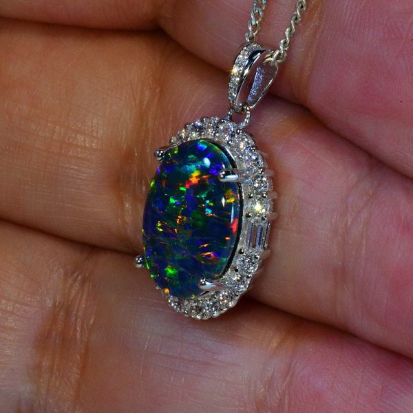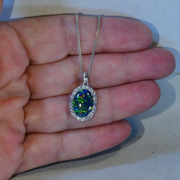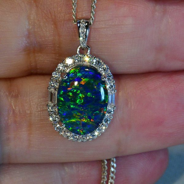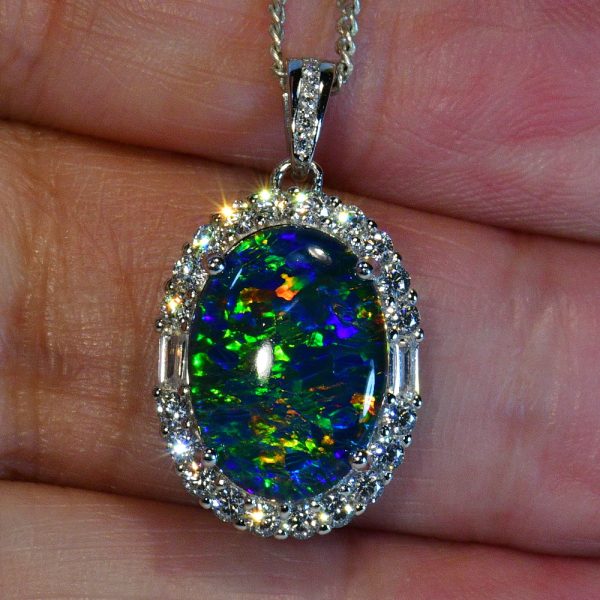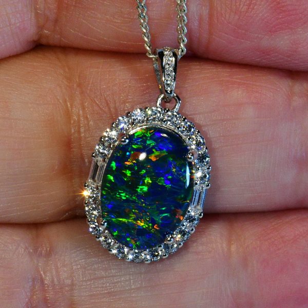 Gorgeous Australian opal in solid sterling silver. This is a beautiful BIG 14.00mm X 10.00mm South Australian opal triplet, with the opal coming from the mines of Coober Pedy in South Australia, displays fantastic N1 dark, 4.2 out of 5 bright green with twinkling orange and blue colouring. Highlighted by 22 cubic zirconias the pendant measures 24mm X 13mm and comes with a complementary 45 cm (18″) plate chain and gift boxed, perfect for that gift giving.