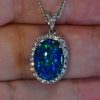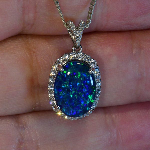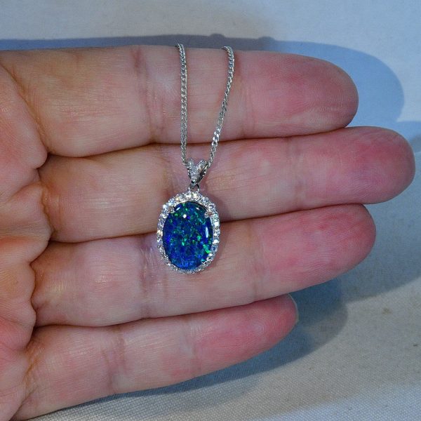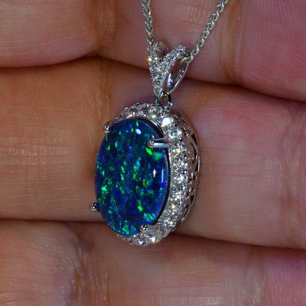 Gorgeous Australian opal in solid sterling silver. This is a beautiful BIG 14.00mm X 10.00mm South Australian opal triplet, with the opal coming from the mines of Coober Pedy in South Australia, displays N1 dark, 3 out of 5 bright green with blue colouring. Highlighted by 22 cubic zirconias the pendant measures 24mm X 13mm and comes with a complementary 45 cm (18″) plate chain and gift boxed, perfect for that gift giving.