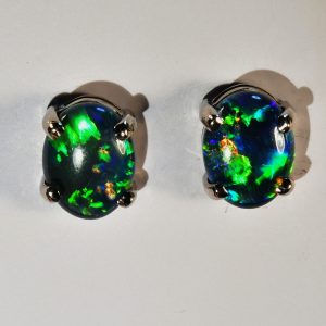 Wonderful solid opals in solid sterling silver. These beautiful 7.0mm X 5.0mm solid natural Coober Pedy white opals display 3 out of 5 bright pink, violet, blue and green colouring. Each highlighted by 17 cubic zirconias , these earrings come gift boxed, perfect for that gift giving.